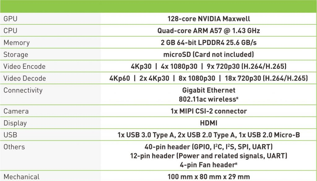 The devkit boots from a removable MicroSD card which can be formatted and imaged from any PC with an SD card adapter. The devkit can be conveniently powered via either the Micro USB port or a 5V DC barrel jack adapter. The camera connector is compatible with affordable MIPI CSI sensors including modules based on the 8MP IMX219, available from Jetson ecosystem partners. Also supported is the Raspberry Pi Camera Module v2, which includes driver support in JetPack. Table 1 shows key specifications.